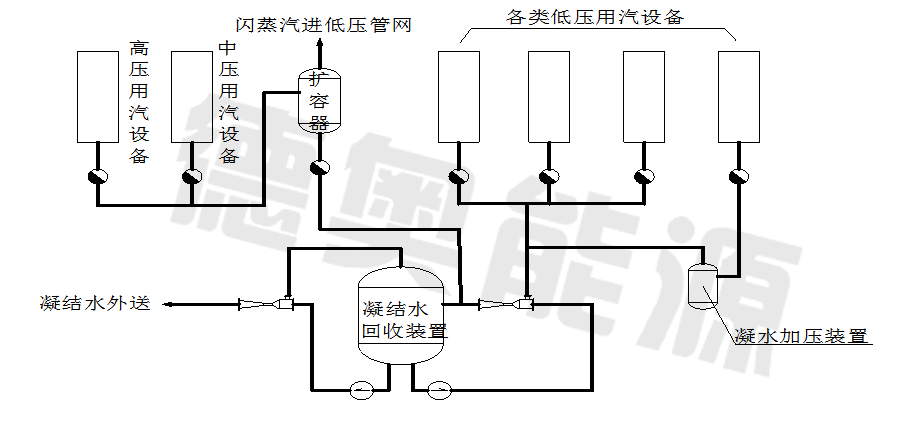 蒸汽作為一種熱能載體,廣泛應(yīng)用于發(fā)電供熱、石油化工、鋼鐵冶金、輕紡印染、造紙、釀造和橡膠等工業(yè)領(lǐng)域中。蒸汽在各種用汽設(shè)備中放出汽化潛熱后,變?yōu)榻跬瑴赝瑝合碌娘柡湍Y(jié)水,凝結(jié)水具有的熱量可達(dá)蒸汽全熱量的20-30%,而且壓力越高凝結(jié)水所具有的熱量越多,凝結(jié)水的回收利用對蒸汽系統(tǒng)高效而合理的利用有實(shí)際意義,100%回收利用凝結(jié)水熱量和工質(zhì),具有很大的節(jié)能潛力。