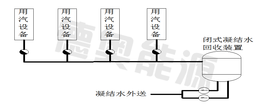 簡單工況指回收系統(tǒng)中多臺用汽設(shè)備工況相近。在簡單工況下可直接與閉式凝結(jié)水回收裝置進(jìn)水口相連達(dá)到閉式回用目的(見圖一)。