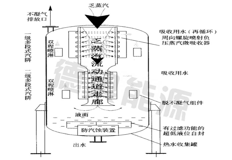 乏汽回收是利用系統(tǒng)中具有一定剩余壓力的蒸汽或水作動力,使流體產(chǎn)生射吸流動,同時進行水與乏汽的熱與質(zhì)直接混合,使低溫流體被加熱,混合溫度可通過調(diào)整進水量大小來完成?;旌纤M入氣液分離罐,分離罐輸出凝結(jié)水,并分離出空氣減壓排出。